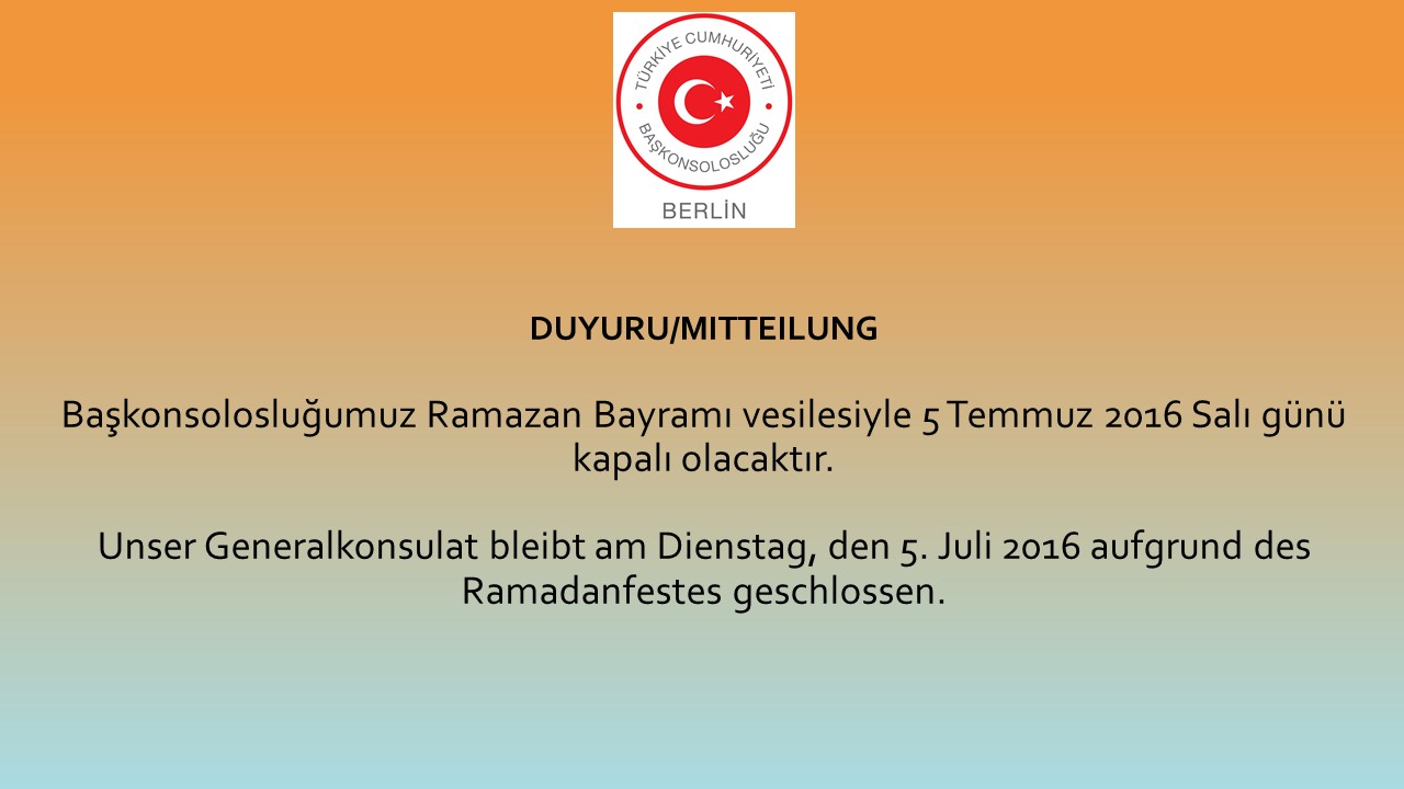 Unser Generalkonsulat bleibt am Dienstag, den 5. Juli 2016 aufgrund des Ramadanfestes geschlossen.